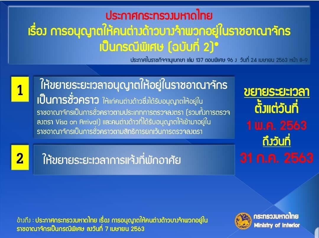 1. ขยายระยะเวลาการอนุญาตให้อยู่ต่อในราชอาณาจักร สำหรับคนต่างด้าวที่ได้รับอนุญาตให้อยู่ในราชอาณาจักรเป็นการชั่วคราวตามประเภทการตรวจลงตรา (รวมทั้งการตรวจลงตรา VISA on Arrival) และคนต่างด้าวซึ่งได้รับอนุญาตให้เข้ามาอยู่ในราชอาณาจักรเป็นการชั่วคราวตามสิทธิการยกเว้นการตรวจลงตรา ตั้งแต่วันที่ 1 พฤษภาคม พ.ศ. 2563 ถึงวันที่ 31 กรกฎาคม พ.ศ. 2563