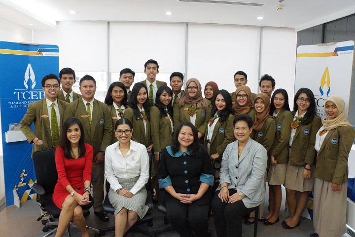 Thailand Convention & Exhibition Bureau (Public Organization) or TCEB, led by Ms Parichat Svetasreni (first row, 2nd from left), Director of Marketing & Corporate Image Department, Ms Waraporn Sornprom (first row, far right), Senior Manager of Corporate Policy & Strategy Department and Ms Arisara Thanuplang, Senior Manager of Corporate Communications Section, Marketing & Corporate Image Department (first row, far left), recently welcomed a group of student from the Bandung Institute of Tourism under the Ministry of Tourism & Creative Economy, Republic of Indonesia. During the visit to TCEB’s office, the executives were on hand to provide information on overall Thailand’s MICE industry and the role TCEB plays to develop and drive growth for this sector.