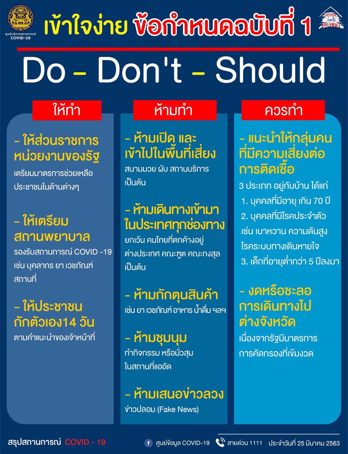 1. ห้ามเข้าพื้นที่เสี่ยง โดยห้ามประชาชนเข้าไปในพื้นที่หรือสถานที่ซึ่งมีความเสี่ยงต่อการติดต่อเชื้อโรคโควิด-19 หรือตามคำสั่งผู้ว่าราชการกรุงเทพมหานคร และผู้ว่าราชการจังหวัด ประกาศปิดสถานที่ซึ่งมีคนจำนวนมากไป รวมตัวกัน เช่น สนามมวย ผับ สถานบริการ เป็นต้น รวมทั้งแหล่งท่องเที่ยวสาธารณะ เช่น แหล่งท่องเที่ยวธรรมชาติ พิพิธภัณฑสถาน ห้องสมุดสาธารณะ ศาสนสถาน โดยให้ผู้ว่าราชการจังหวัดพิจารณาตามความเหมาะสม